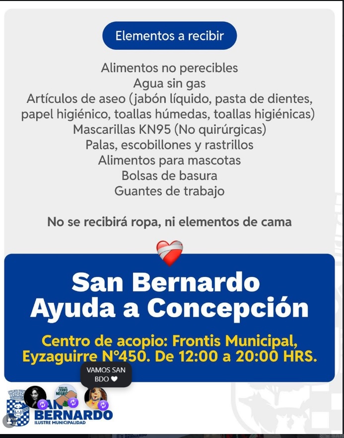 En San Bernardo y Calera de Tango, por ejemplo, el centro de acopio está ubicado en los respectivos municipios, mientras que en Buin los que deseen cooperar deben acercarse al centro cultural. En Paine, en tanto, la ayuda se estará recibiendo en Avda. 19 de Septiembre 1421.