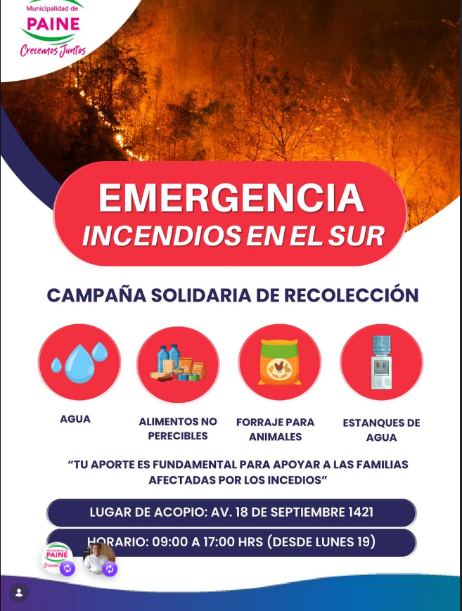 MAIPO. Los cuatro municipios de la Provincia de Maipo (San Bernardo, Buin, Paine y Calera de Tango) levantaron campañas solidarias para ir en ayuda de los daminficados de los incendios forestales que afectan a zonas del Bío Bío, Ñuble y La Araucanía.