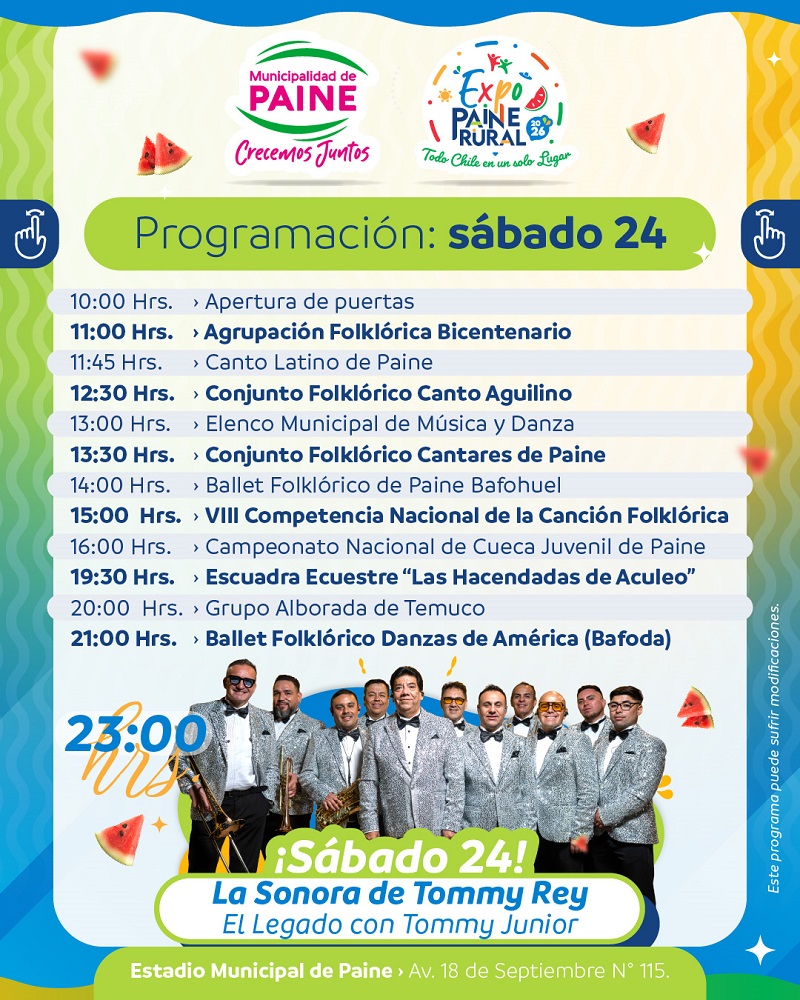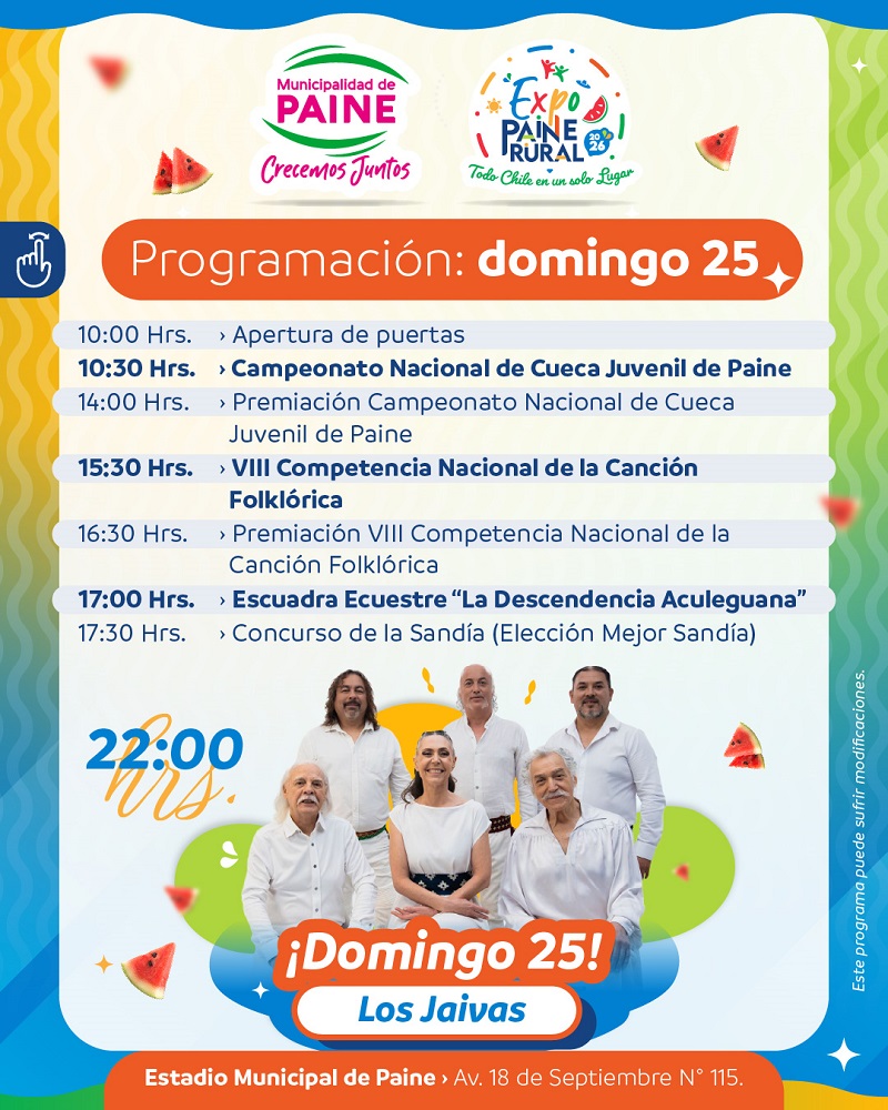 PAINE.- Como ya es tradición, este fin de semana la Provincia de Maipo y toda la Región Metropolitana tendrán la oportunidad de vivir una nueva edición de la Expo Paine Rural 2026. Este viernes 23, sábado 24 y domingo 25 de enero, las tradiciones del campo chileno se volcarán en 7.000 m2 de terreno para ofrecer cocinería criolla, artesanías, zonas de descanso y, por supuesto, coronar a la reina del evento, la sandía.
